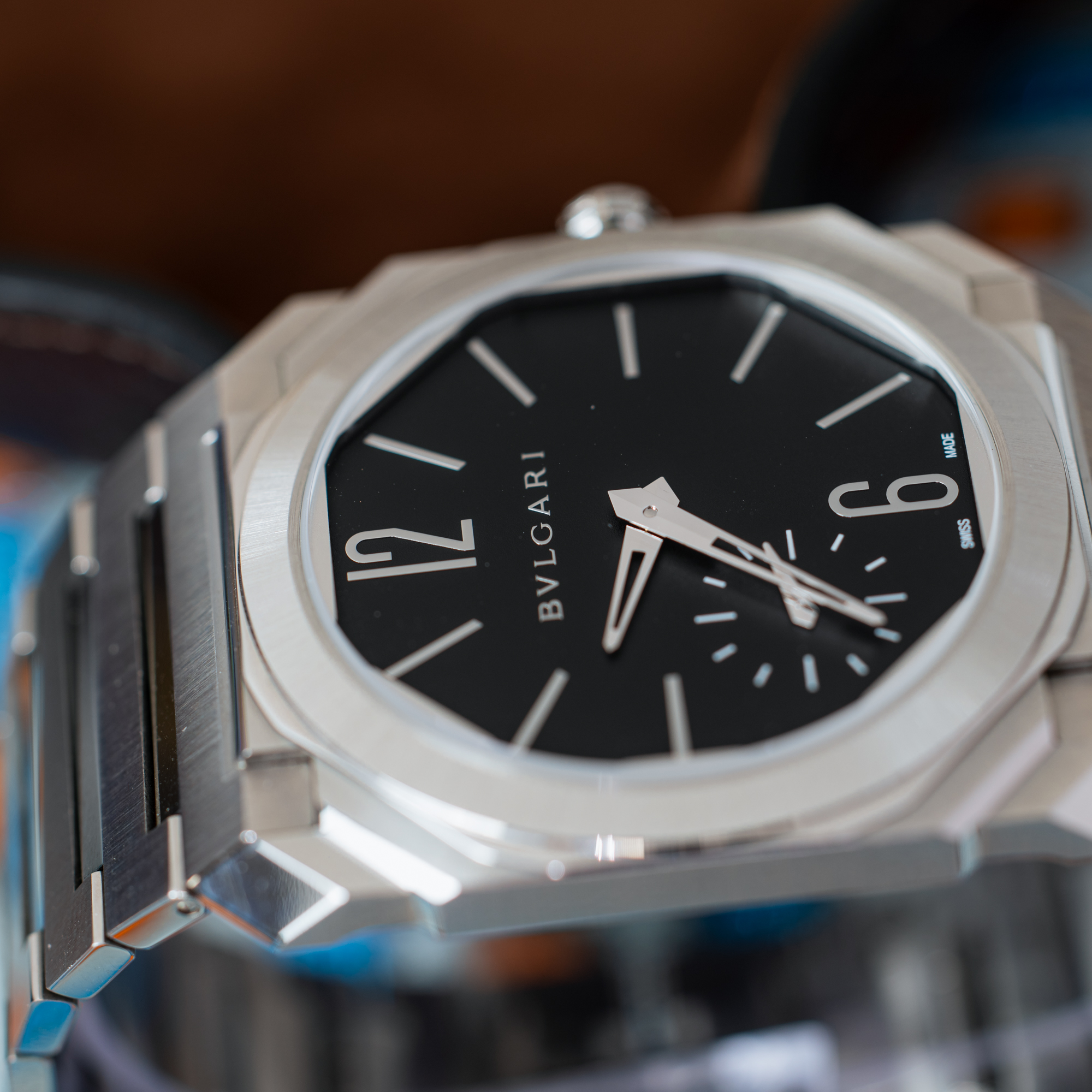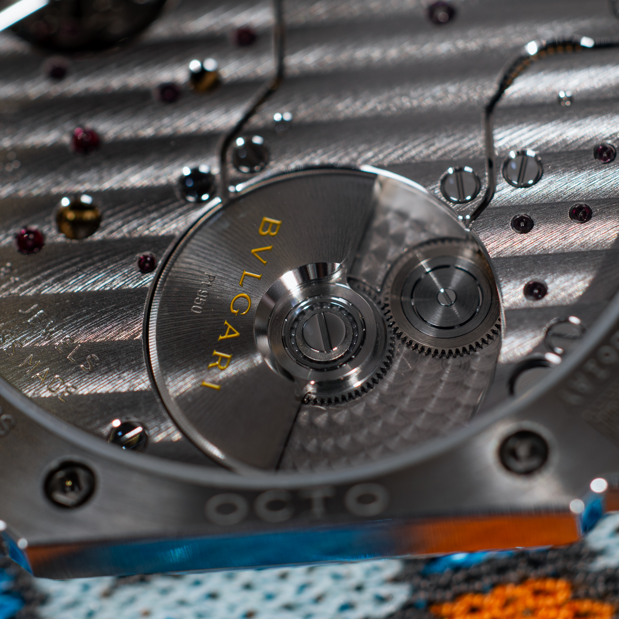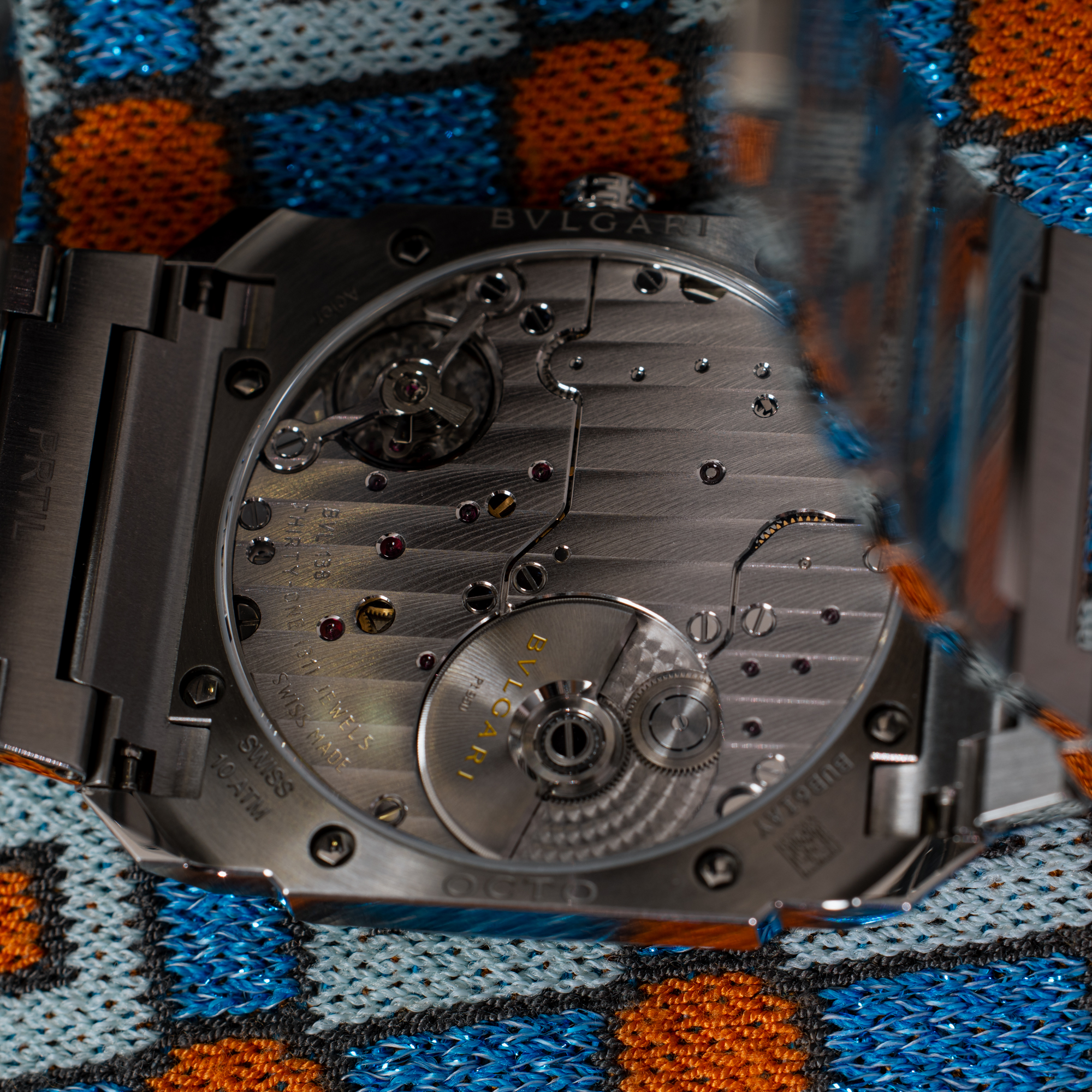 Najbardziej spektakularnym elementem tej referencji jest koperta o grubości zaledwie 6,4 mm — wynik imponujący, szczególnie w połączeniu z automatycznym mechanizmem. Architektoniczna, wielopłaszczyznowa forma koperty Octo w połączeniu z w pełni zintegrowaną stalową bransoletą tworzy spójną, niezwykle nowoczesną sylwetkę. Charakterystyczne, satynowe wykończenie powierzchni nadaje całości surowy, techniczny charakter, który stał się znakiem rozpoznawczym linii Finissimo.